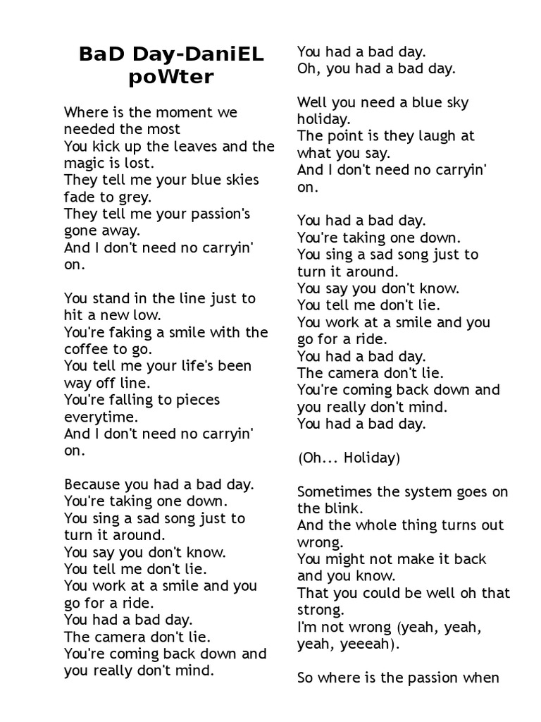 Bad Day Lirik Lagu Pdf Pop Songs Music Videos